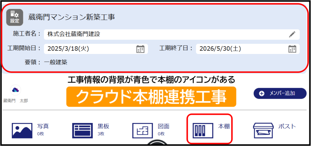 判断方法につきましては、『蔵衛門クラウド』の工事一覧を開き、該当の工事情報の背景の色が、「青色」で「本棚」のアイコンがあれば、「クラウド本棚」へ対応しております。