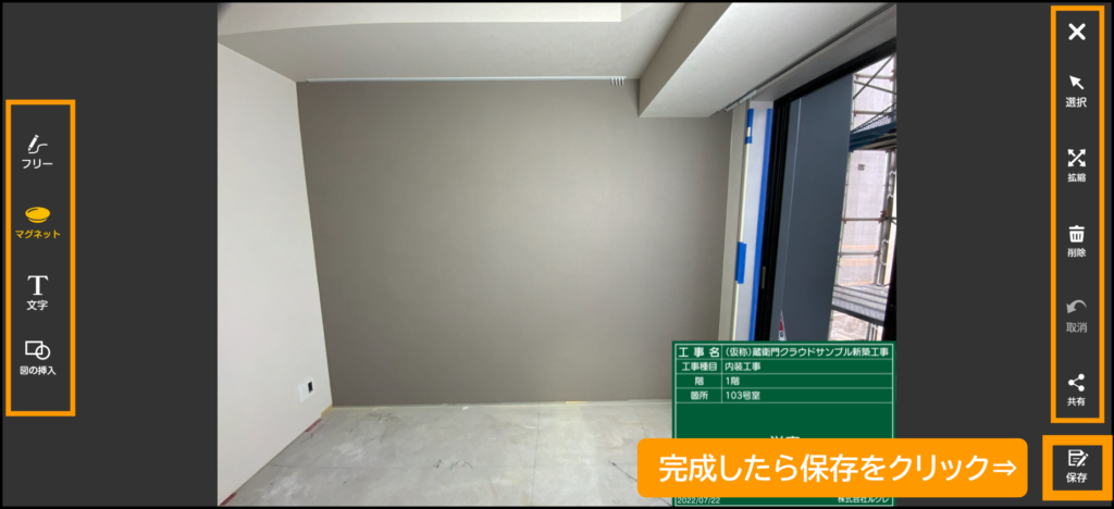 現場で撮影した直後に、専用端末からその場でマーカーを記入できます。